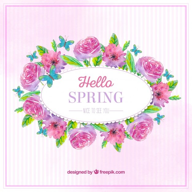 Spring background with red flowers and watercolor leaves