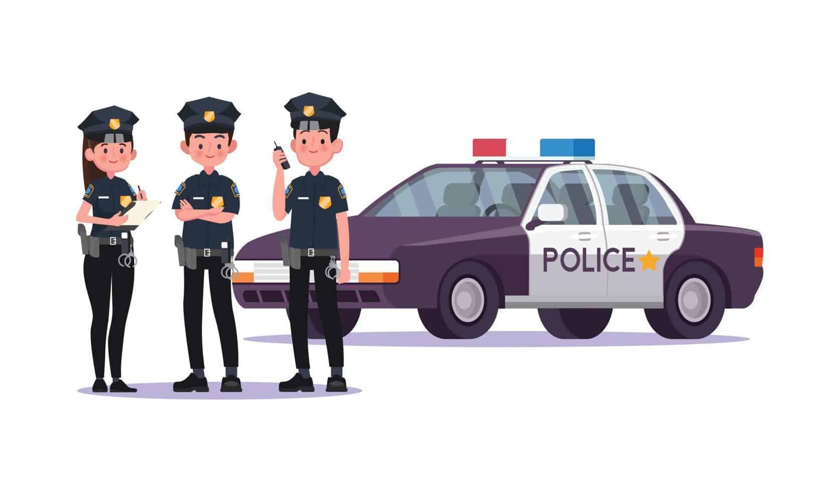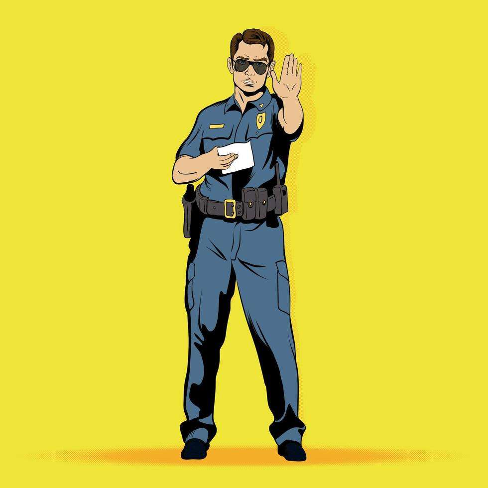 Happy Cute Boy Wearing Police Uniform Stand Beside Traffic Lamp