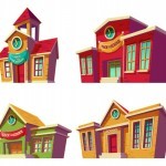 - Set of vector illustrations cartoon of various color educational institutions, schools