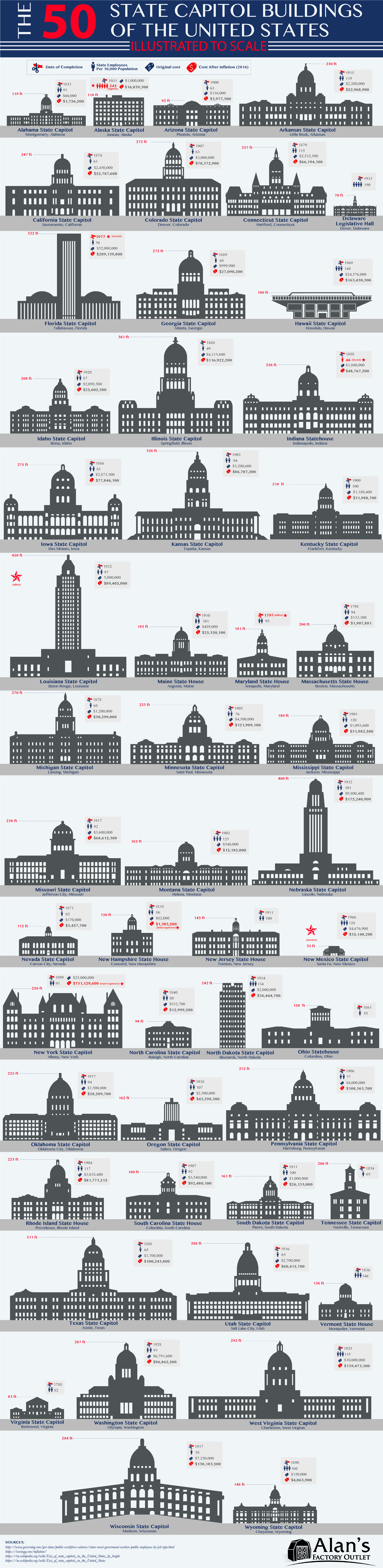 The 50 State Capitol Buildings of the United States Illustrated to Scale