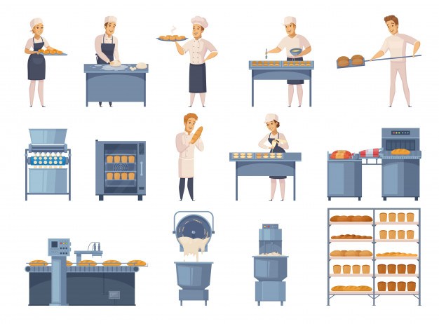 Food Business Cartoon Bakery Chef Shop Person Bread Wheat Factory Worker Elements Product Brick Machine Industrial Hot Eating Fresh Tool Baking Pastry Production Meal Flour Oven Baker Manufacturing Collection Shelves Automation Set Equipment Machinery Tray Goods Bun Conveyor Dough Loaf Foodstuff Kneading