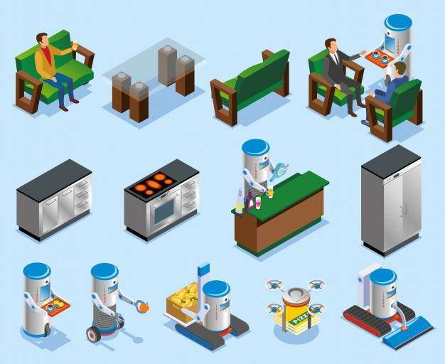 Food Technology Computer Restaurant Character Science Cafe Metal Human Robot Isometric Modern Industry Futuristic Service Future Innovation Machine Customer Electronic