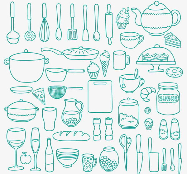 drawing drawn equipment Fork hand hand drawing hand drawn illustration Kitchen kitchen tools Knife Mug pan pin pot rolling pin Sketchy supplies tools whisk