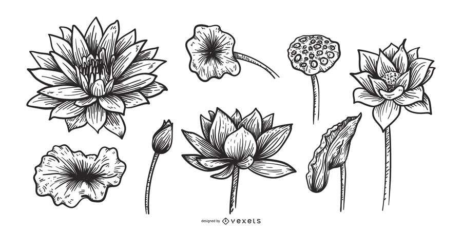 lotus flower nature floral plant water lily bud bloom blooming beautiful hand drawn illustration collection set royalty free