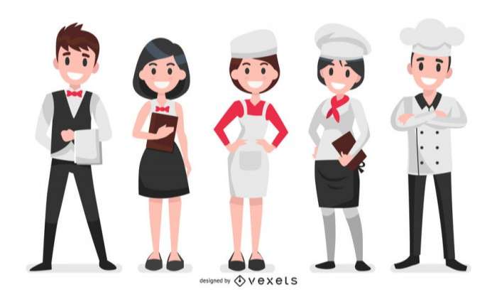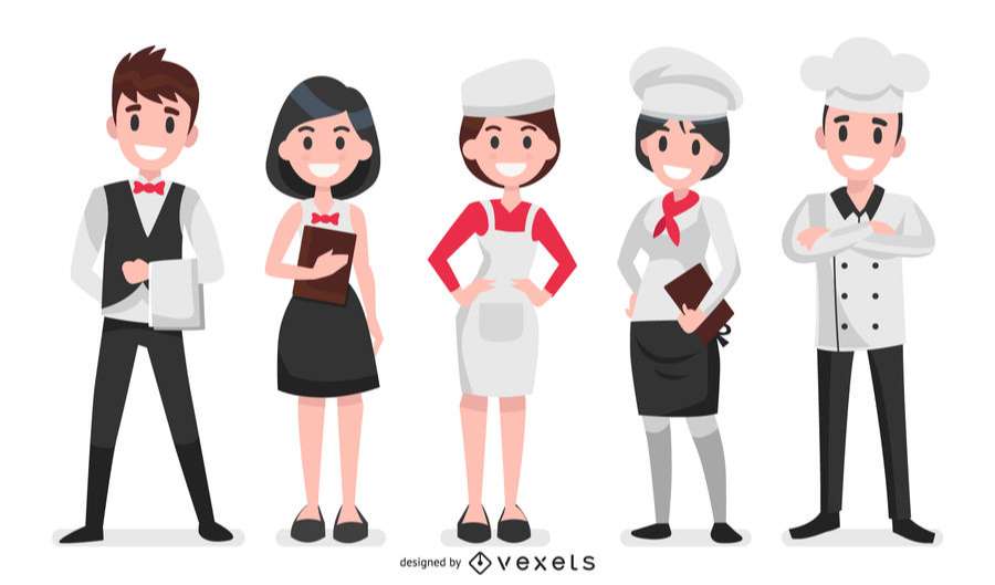 restaurant character chef waiter waitress staff cook cooking serve serving hat food cuisine kitchen illustration collection set royalty free personnel