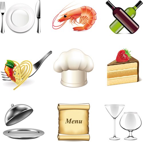 Tableware with food vector icons set