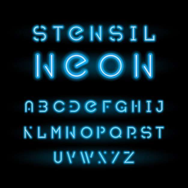 Stencil neon typeface, blue modular round alphabet